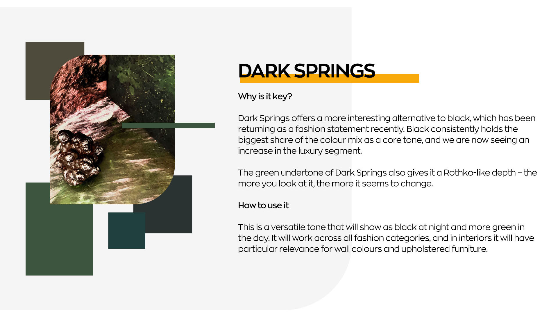Yellow has been emerging as a statement colour for a number of seasons, and Lemon Sherbet will offer a fresh update for S/S 21. Complement this zingy tone with Apple Buzz, and ground it with Green Dream to evolve citrus-tone palettes. This story also offers a bridge between digital and natural colour messages.
