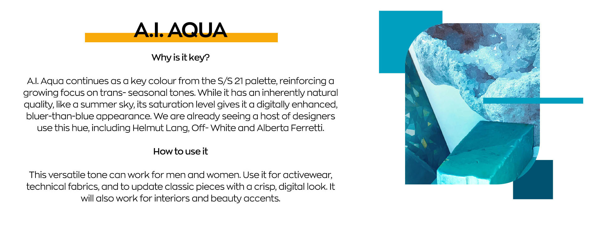 A.I. Aqua is a must-have colour for the season. It’s inspired by tech aesthetics, and will bring a new vibrancy to designs. Incorporate this new colour alongside tonally related hues of Blue Beat, French Navy, Good Grey, and Digital Mist as an accessible palette for directional designs.